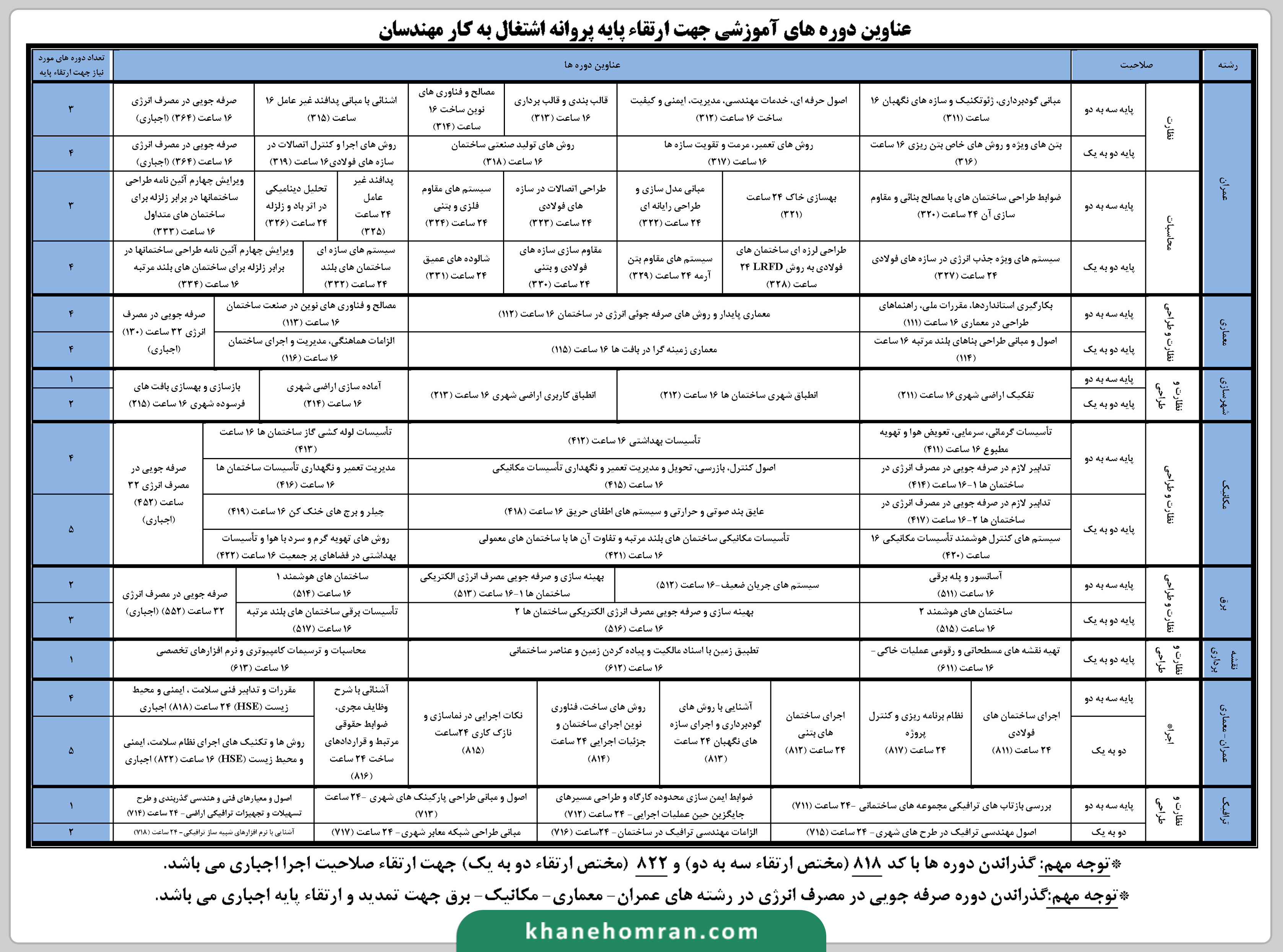 دورههای آموزشی ارتقا پایه نظام مهندسی برای تمامی رشتهها و صلاحیتها در جدول زیر آمده است.