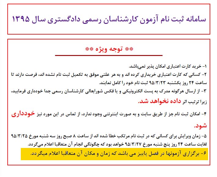 اطلاعیه سامانه ثبت نام آزمون کارشناسان رسمی دادگستری سال 1395 در مورد زمان آزمون